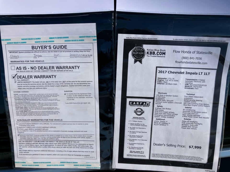 FLOW CERTIFIED! 12 MONTHS/12000 MILE WARRANTY 3 day money back guarantee and a free maintenance package on this 2017 Chevrolet Impala Black LT! **