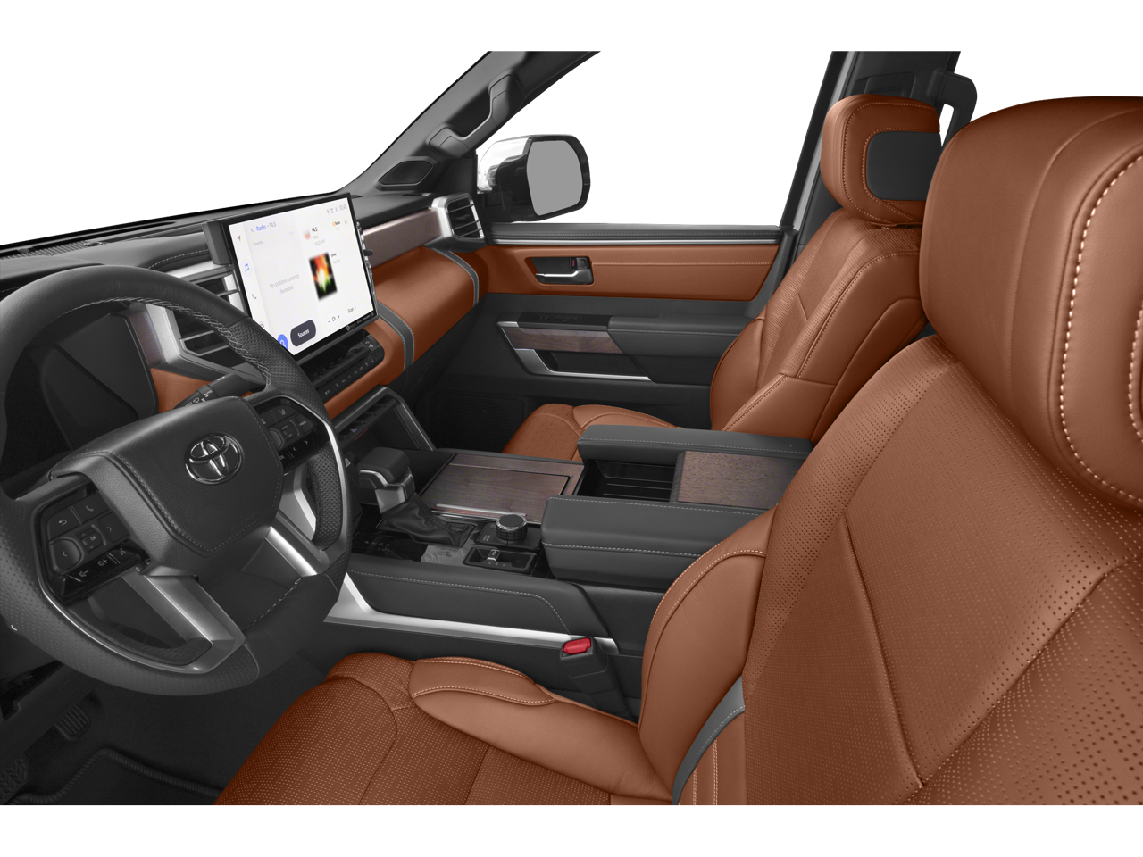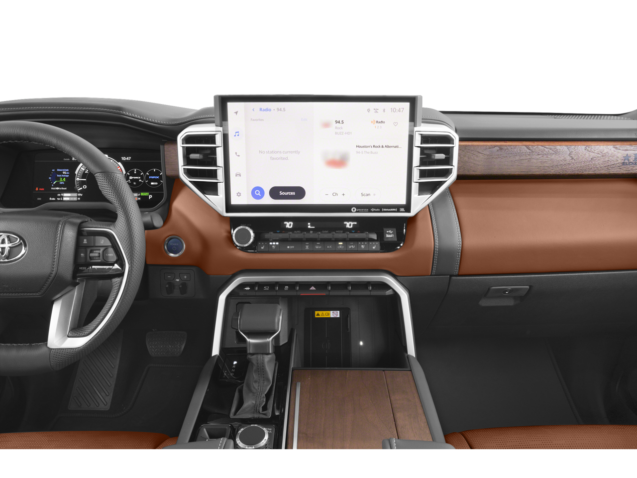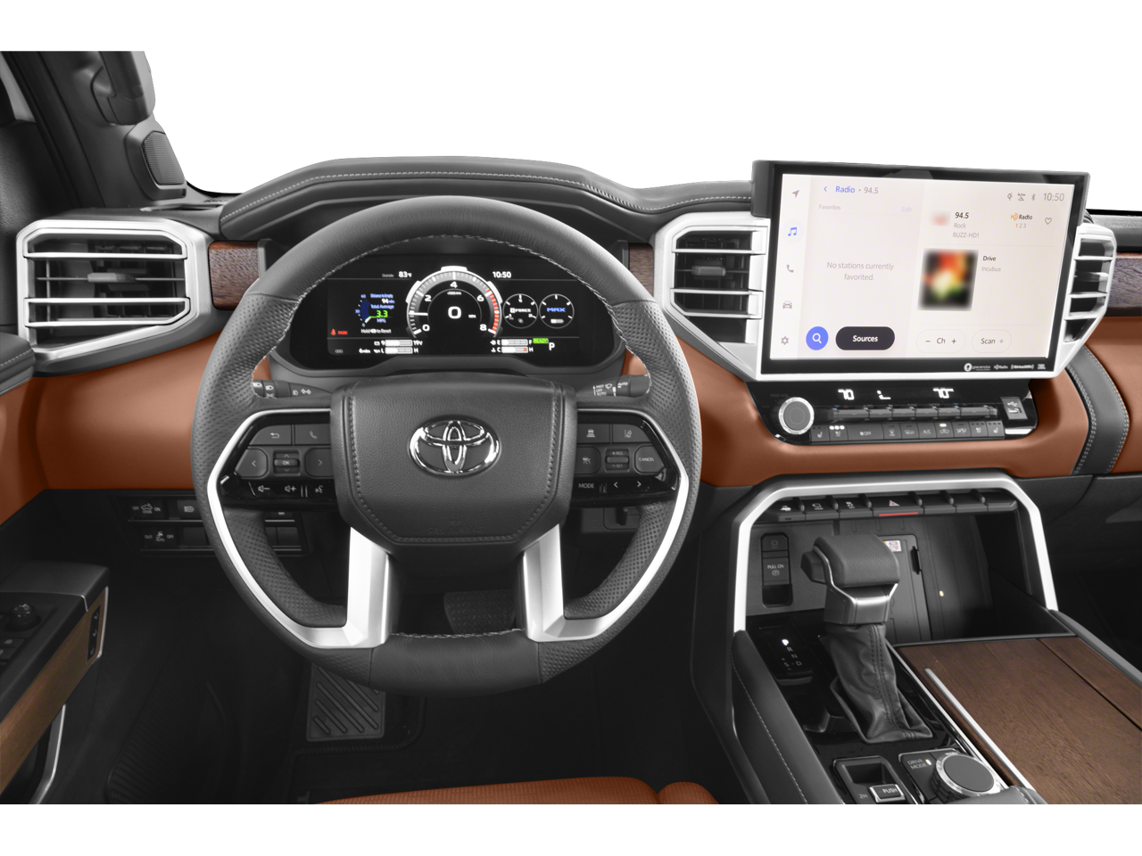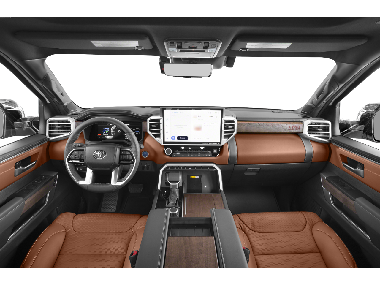 Step inside the Tundra Hybrid 1794 Edition and be captivated by the premium leather-trimmed seats heated and ventilated for your ultimate comfort. The 10-inch color Head-Up Display (HUD) keeps all the crucial information right in your line of sight allowing you to stay focused on the road ahead. The TRD leather shift knob and the heated steering wheel add a touch of refined sportiness to your driving experience.